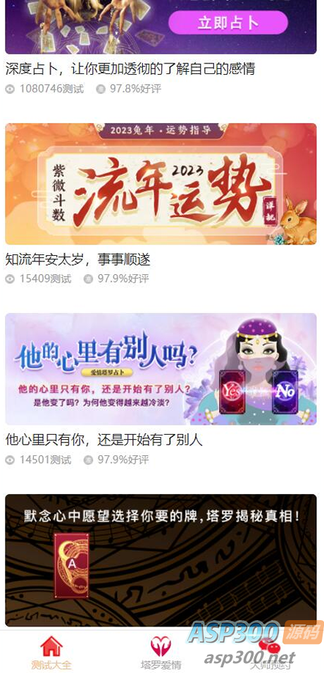 八字精批、事业财运、姓名分析、宝宝起名、公司测名、姓名配对、综合详批、姻缘测算、牛年感情、PC版测算、八字合婚、紫微斗数、鼠年运程、月老姻缘、许愿祈福、号码解析、塔罗运势、脱单占卜、感情继续、脱单占卜、塔罗爱情、心理有你、能否复合、暗恋对象、是否分手、爱着别人、大师服务(包含多项功能)共计30余项功能,全网功能全,完善的版本。