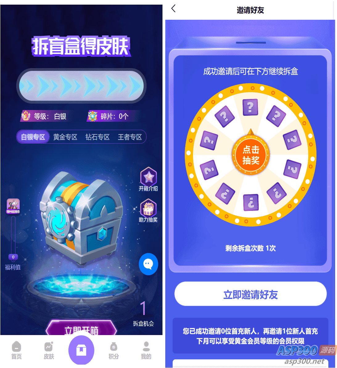 二开运营版王者荣耀皮肤抽奖系统:游戏皮肤盲盒、盲盒商城抽奖盲盒前端UNIAPP