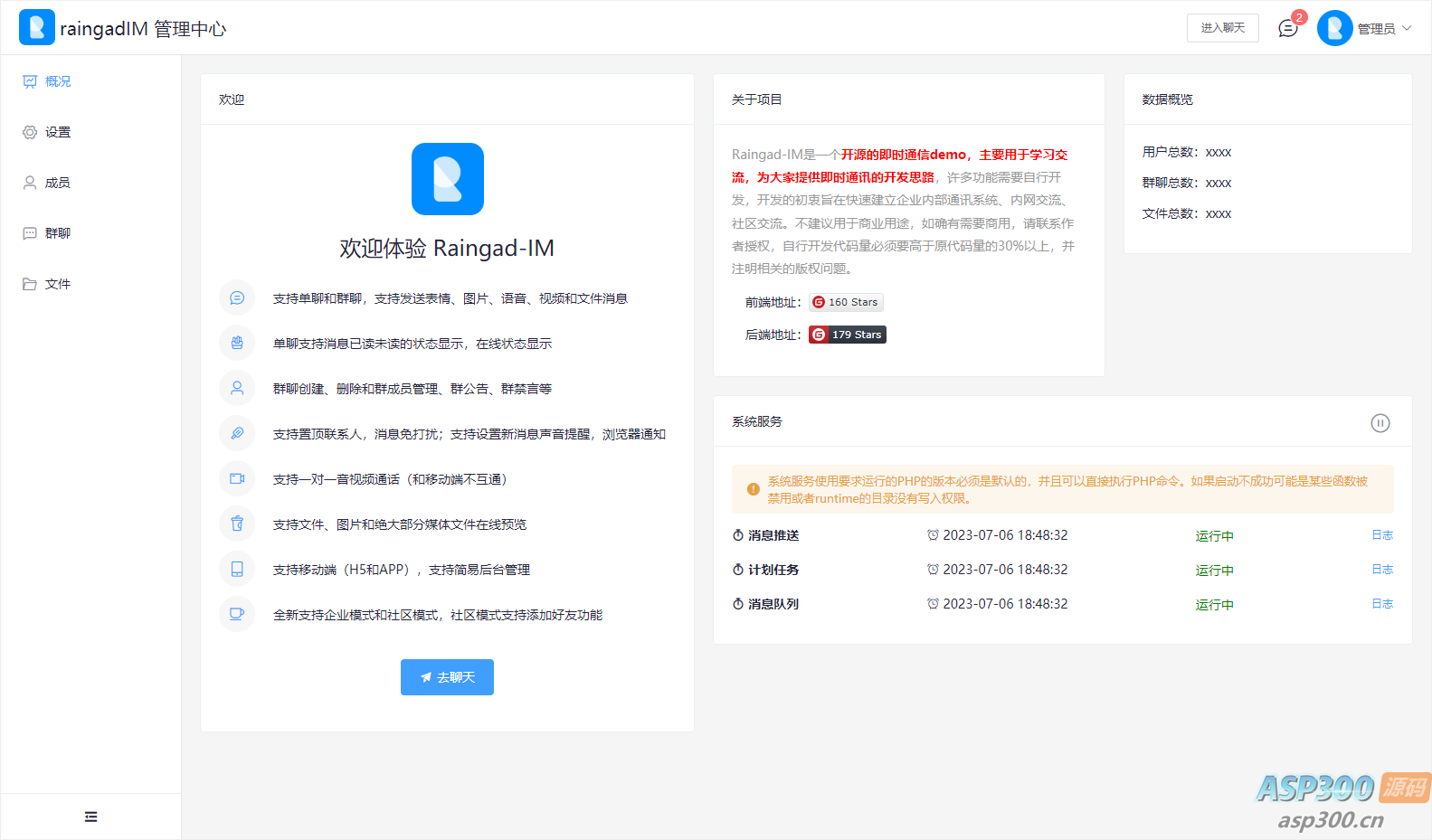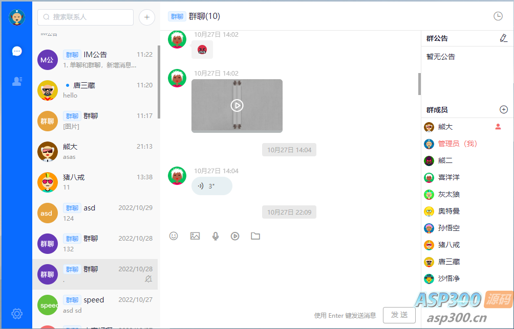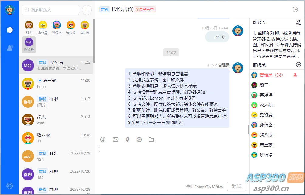 单聊和群聊功能,可以方便地发送表情、图片、语音、视频和文件消息。在单聊中,我们支持消息的已读和未读状态显示,并展示在线状态。群聊功能包括创建、删除、管理群成员、发布群公告以及禁言等功能。你可以将常联系人置顶,并设置消息免打扰。我们支持自定义新消息声音提醒,并提供浏览器通知功能。管理员可以撤回群成员的消息。群成员之间不能互相添加好友。我们支持一对一音视频通话(已实现Web端和移动端的通话功能,小程序不支持)。你可以在线预览文件、图片和大多数媒体文件。我们支持移动端(包括H5、APP和小程序),尽管部分功能在不同平台上可能存在兼容性问题。全新支持企业模式和社区模式,社区模式下支持用户注册和添加好友功能。APP支持单聊消息的在线和离线推送(需要自行申请unipush服务)。我们提供简易的后台管理功能,包括用户管理、群组管理和系统设置等。