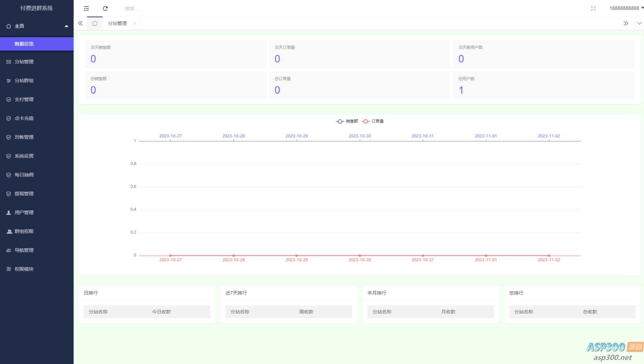 总后台的账号是18888888888,密码是123456分销后台:在域名后面加上fenxiao.php就能进入分站后台:在域名后面加上substation.php就能进入功能使用说明:每个功能旁边都会有示例截图哦