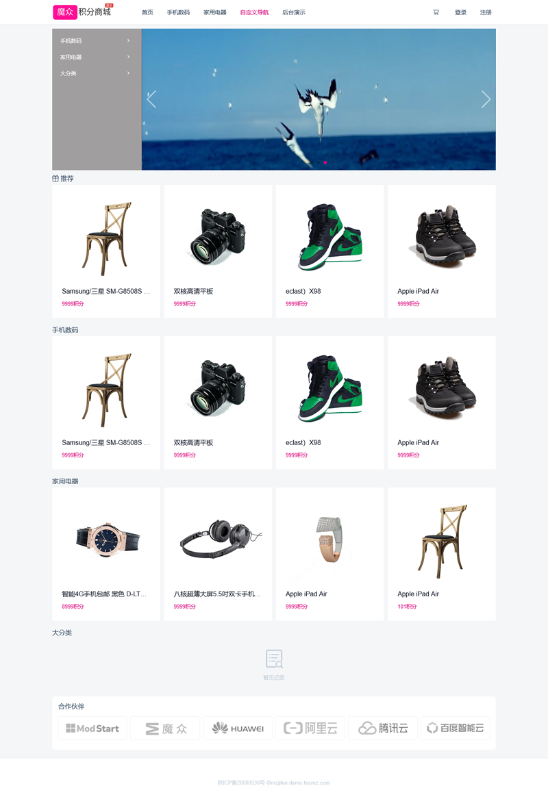 魔众积分商城系统提供积分商城,会员积分系统,积分兑换商城,积分系统,积分运营,营销活动工具,积分游戏。API接口对接会员积分系统,简单配置页面即可上线,助力企业会员运营管理。