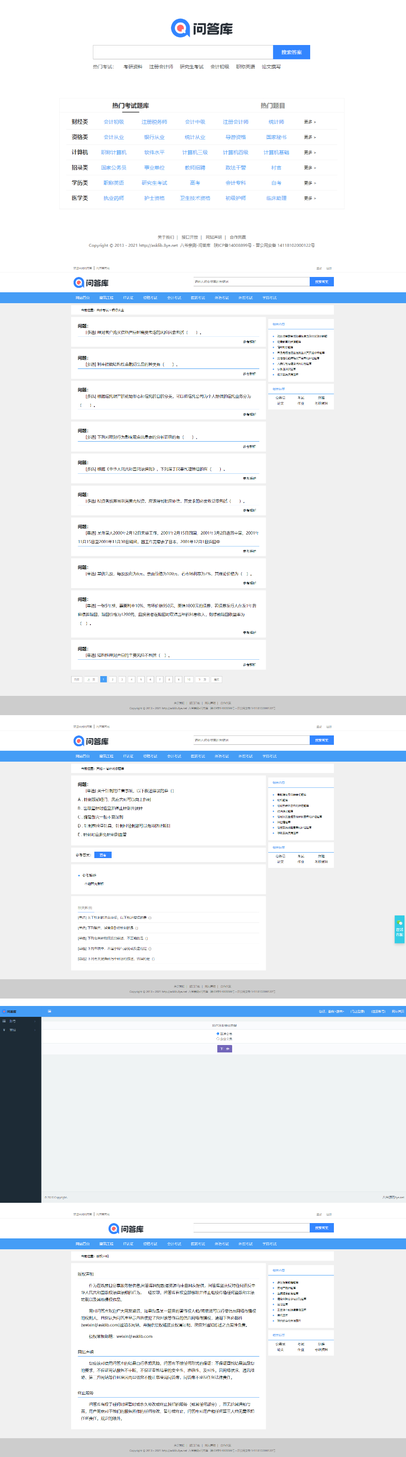 源码名称:仿《问答库》题库问答学习平台模板 知识付费网站源码开发环境:帝国cms 7.5安装环境:php+mysql学历考试等各类题库以及一些常见的普通练习的题目题库供大家查询。特色功能: