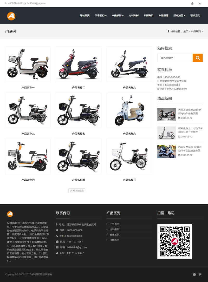 (自适应手机版)响应式电动自行车踏板车类网站织梦模板 HTML5电动车生产销售企业网站源码下载该模板是非常容易存活的,这样的网站很容易吸引访客点击,提升ip流量和pv是非常有利的,随便挂点联盟广告都能养活网站。本套织梦模板采用现在非常流行的全屏自适应布局设计,且栏目列表以简洁,非常时尚大气。页面根据分辨率大小而自动排版,很大程度上改善了页面宽度兼容问题,适应大部分显示器分辨率尺寸哦。模板整体以多种颜色为主色调,适合做各种类型的网站。同一个后台管理三网合一简单方便,体验极佳