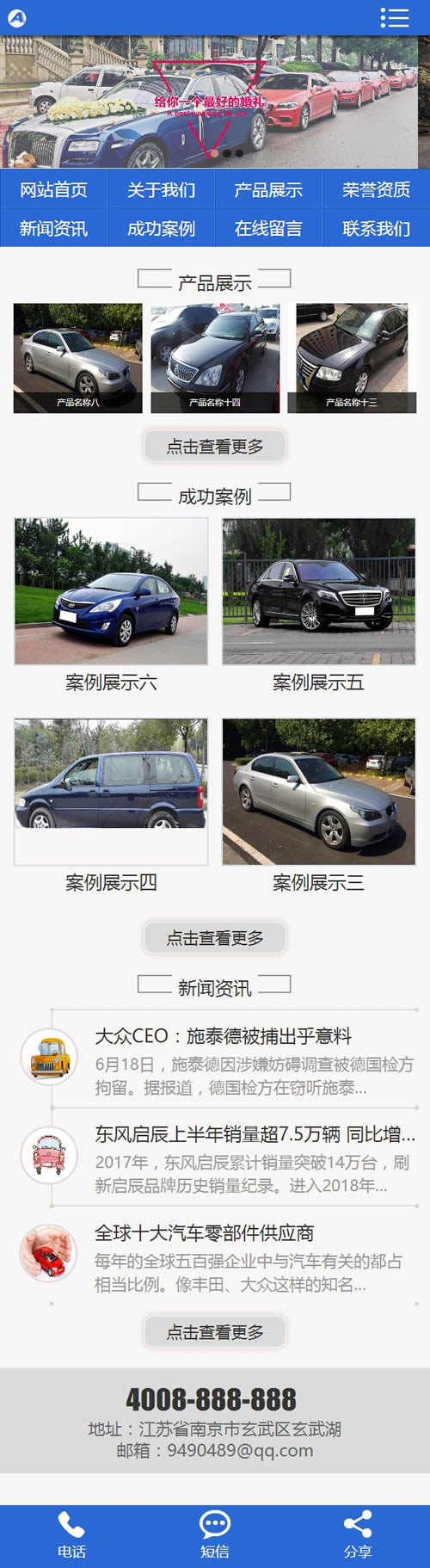 (带手机版数据同步)汽车租赁贸易类织梦模板 租车婚车租赁网站源码下载这款模板使用范围极广,不仅仅局限于一类型的企业,你只需要把图片和产品内容更换下,适用于任何行业。本套织梦模板采用现在非常流行的全屏自适应布局设计,且栏目列表以简洁,非常时尚大气。页面根据分辨率大小而自动排版,很大程度上改善了页面宽度兼容问题,适应大部分显示器分辨率尺寸哦。模板整体以多种颜色为主色调,适合做各种类型的网站。同一个后台管理三网合一简单方便,体验极佳