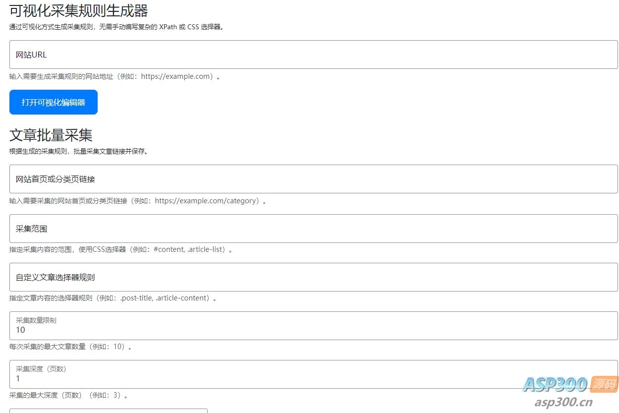 采集指定网站或页面的内容,支持单篇文章和批量采集。提供可视化采集规则生成器,用户可以通过点击操作生成采集规则。支持自定义采集范围和文章选择器规则。批量采集