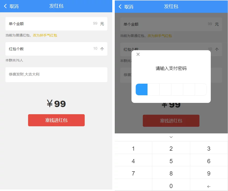 2、增加红包发送2种方式(拼手气红包和固定金额红包)