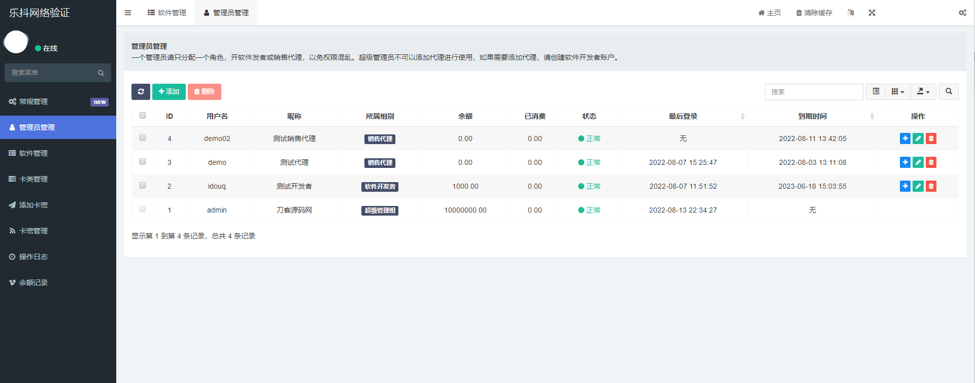 支持代理系统,支持代理到期时间设置,支持充值,扣款,封禁