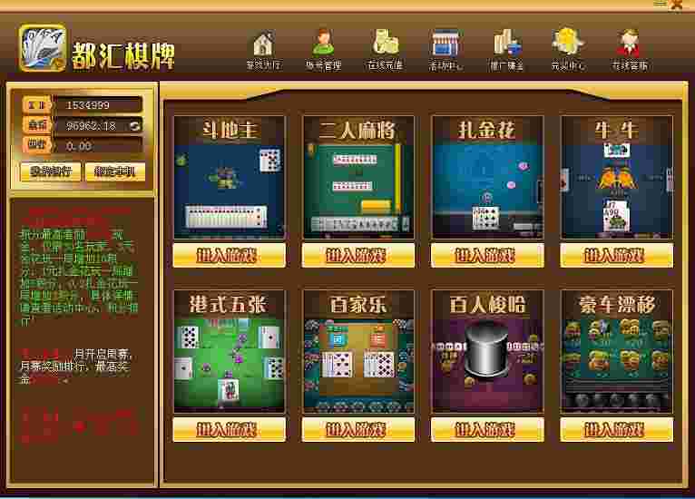莱恩最新稳定都汇棋牌游戏完整运营版,含有八款热门游戏:斗地主、二人麻将、牛牛、扎金花、新版港式五张、百家乐、百人梭哈、豪车漂移,这一套是今年上线运营过的,目前是最好的一个版本,功能非常强大,程序非常的完美,不绑定域名,不限制机器,完美运营版本,带有高智能机器人。
