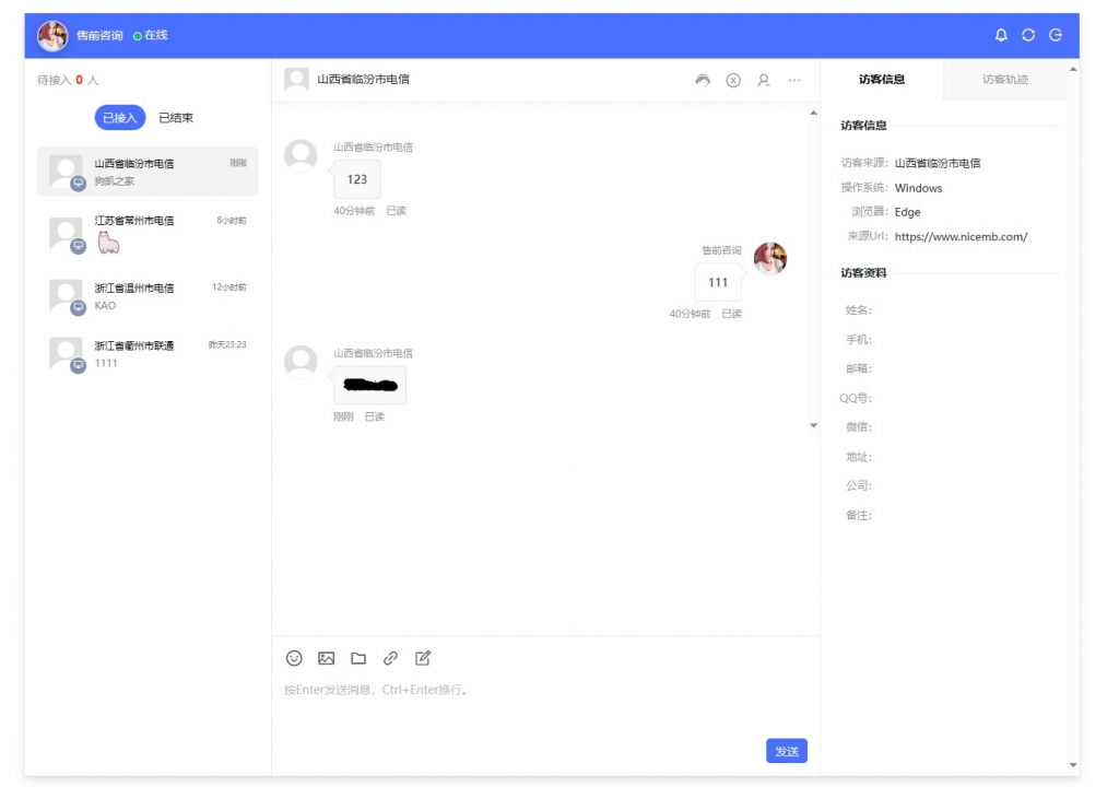 支持消息的已读、未读状态,支持结束会话,拉黑访客(拉黑后无法再会话),支持查看访客来源(操作系统、浏览器,URL地址)。