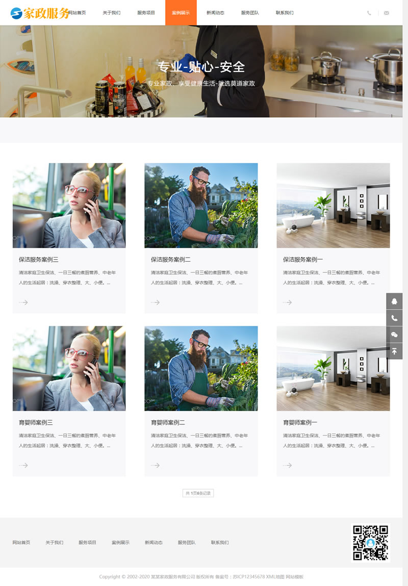 本套织梦模板采用织梦最新内核开发的模板,这款模板使用范围广,不仅仅局限于一类型的企业,家政保洁、保姆月嫂类的网站都可以用该模板。你只需要把图片和文章内容换成你的即可,颜色都可以修改,改完让你耳目一新的感觉!布局规整,利于用户体验,手工书写DIV+CSS,代码精简。同一个后台管理 三网合一简单方便,体验好!