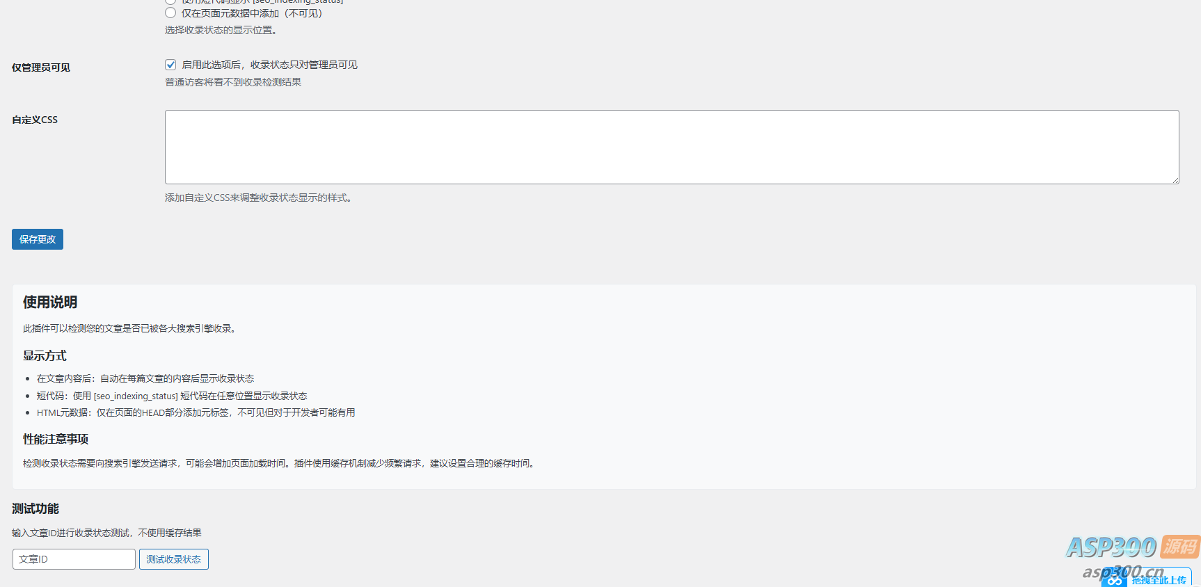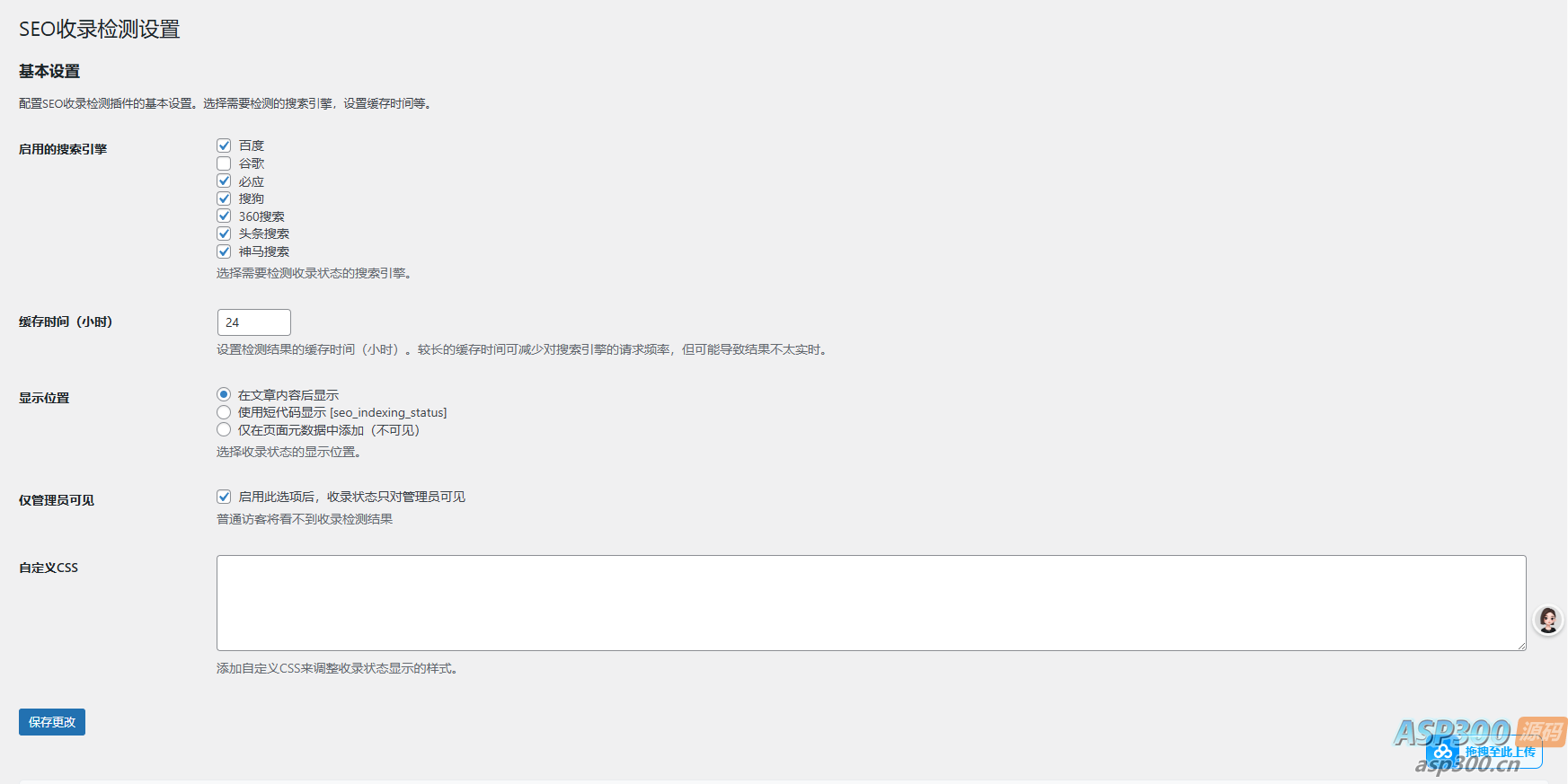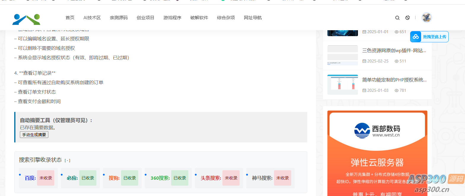 SEO收录检测是一款专为WordPress网站设计的插件,可以自动检测并显示文章是否被各大搜索引擎(百度、搜狗、360、必应、头条、神马、谷歌)收录。通过直观的界面展示收录状态,帮助站长了解网站内容的收录情况,进而优化SEO策略。功能特点1. **多引擎支持**:同时支持7个主流搜索引擎的收录检测– 百度搜索– 谷歌搜索– 必应搜索– 搜狗搜索– 360搜索– 头条搜索– 神马搜索2. **灵活显示方式**:– 自动在文章末尾显示– 通过短代码在任意位置显示– 仅作为元数据添加(不可见)3. **美观的横向显示**:– 搜索引擎图标和名称清晰展示– 收录状态一目了然– 响应式设计,适配各种设备4. **管理员可见选项**:– 可设置收录状态仅对管理员可见– 避免向普通访客展示技术信息5. **缓存机制**:– 减少重复请求,提高网站性能– 可自定义缓存时间(1-168小时)– 自动清理过期缓存6. **自定义样式**:– 支持添加自定义CSS调整显示效果– 可以完全控制收录状态的外观7. **精准检测**:– 通过多种技术手段确保检测结果准确– 检查特定URL路径,避免误判## 系统要求– PHP 7.0 或更高版本– WordPress 4.6 或更高版本– 服务器需支持cURL扩展– 稳定的网络连接,能够访问各大搜索引擎## 安装方法### 方法一:通过WordPress后台安装1. 下载插件ZIP压缩包2. 登录WordPress管理后台,进入”插件” > “安装插件”3. 点击”上传插件”,选择下载的ZIP文件4. 上传完成后点击”现在安装”5. 安装成功后点击”启用插件”### 方法二:通过FTP安装1. 下载并解压插件ZIP压缩包2. 通过FTP客户端连接到您的网站服务器3. 将解压后的文件夹上传到`/wp-content/plugins/`目录4. 登录WordPress后台,进入”插件”页面5. 找到”SEO收录检测”插件并点击”启用”## 使用指南### 基本配置1. 在WordPress后台导航至”设置” > “SEO收录检测”2. 在设置页面中:– 选择需要检测的搜索引擎– 设置缓存时间(1-168小时)– 选择显示位置– 设置是否仅对管理员显示– 可选:添加自定义CSS样式3. 点击”保存更改”按钮应用设置