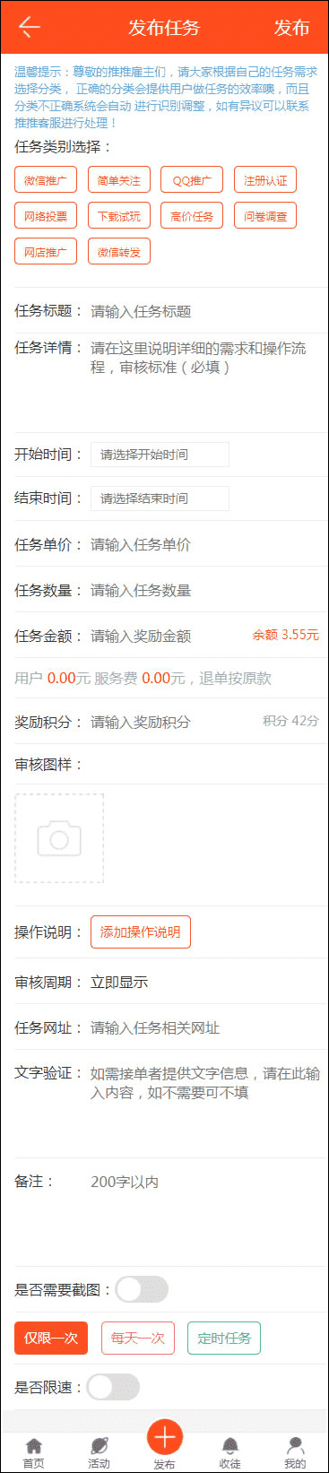 源码可用,版主已经测试!!!可以用来发布任务,让更多的人去接单,比如你可以做刷单任务,点赞任务,抖音快手关注任务,至于怎么用这个靠你发挥自己的想象力啦!